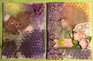 Использовала спреи (я и так знала, что цветовая гамма в моей "коллекции" страдает от нехватки основных цветов, но во время работы над альбомом этот вопрос встал очень остро; однако, пришлось обходиться тем, что было, а были спреи - зеленый и пурпурный, а так же чернила для дозаправки пигментных подушечек - розового цвета и горчичного). Применила (спустя пару лет после приобретения!) ажурную вырубку и салфеточку.