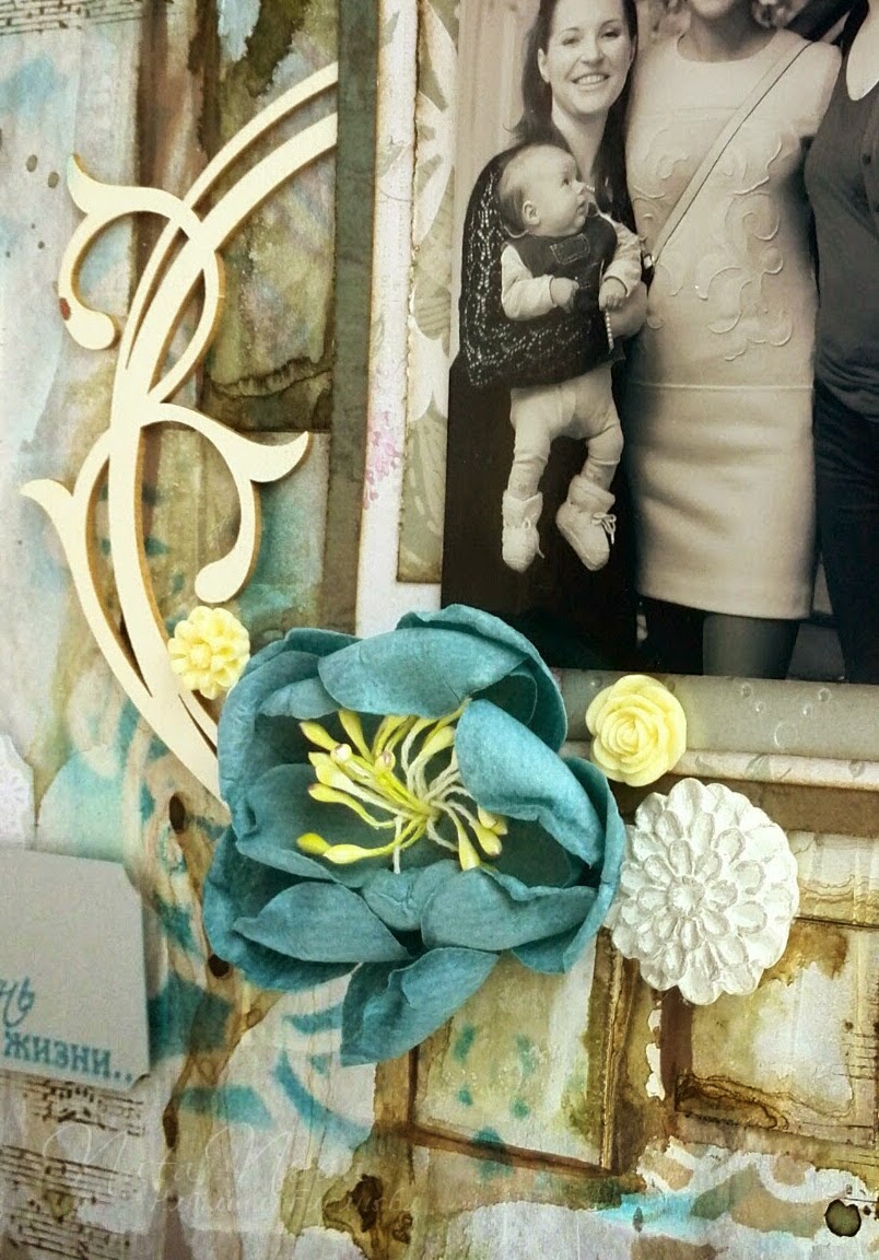 У меня есть небогатый опыт использования различных техник, которые применяются в ММ, но техника с обрисовкой краской кусочков фона мне была абсолютно незнакома. И попытки сделать что-то "как у Тани в МК" закончились вот этой страничкой (это ее третий вариант :)). Вообще для меня оказалось сложным работать именно кистью. Все-таки я ее боюсь :) Вот со спреями как-то легче. Очень помог Танин совет держать под рукой салфетку и стирать то, что не нравится. Я сама до этого раньше не додумалась :)