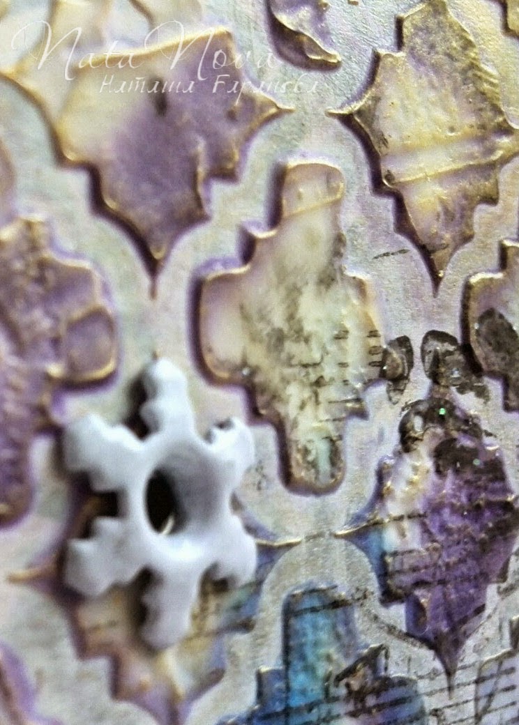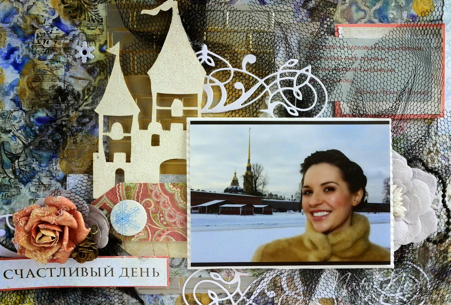 2. На фото зима и Петропавловка (ну, кроме меня, конечно :))). Мне важно было подчеркнуть крепость и золотой шпиль, и еще время года. Поэтому появилась подложка с тиснением "кирпичная кладка", замок, золотая краска - это для собора и крепости, а белый цвет, снежинки, роза во льду - это про зиму :)