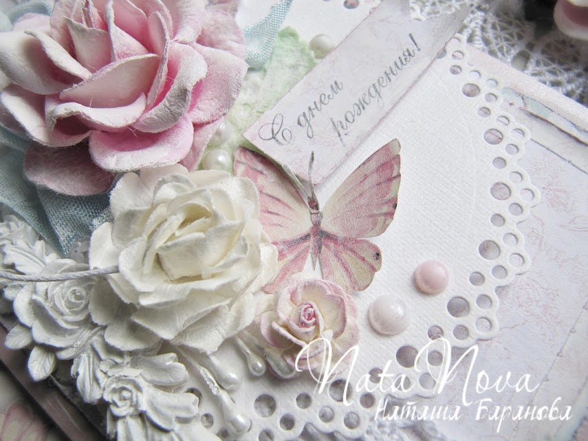 Наташа! Открытка очень нравится! Очень мило и нежно! Салфеточка из скрапбумаги так удачно вписалась, и гипсовый веночек придает объем. Здорово!